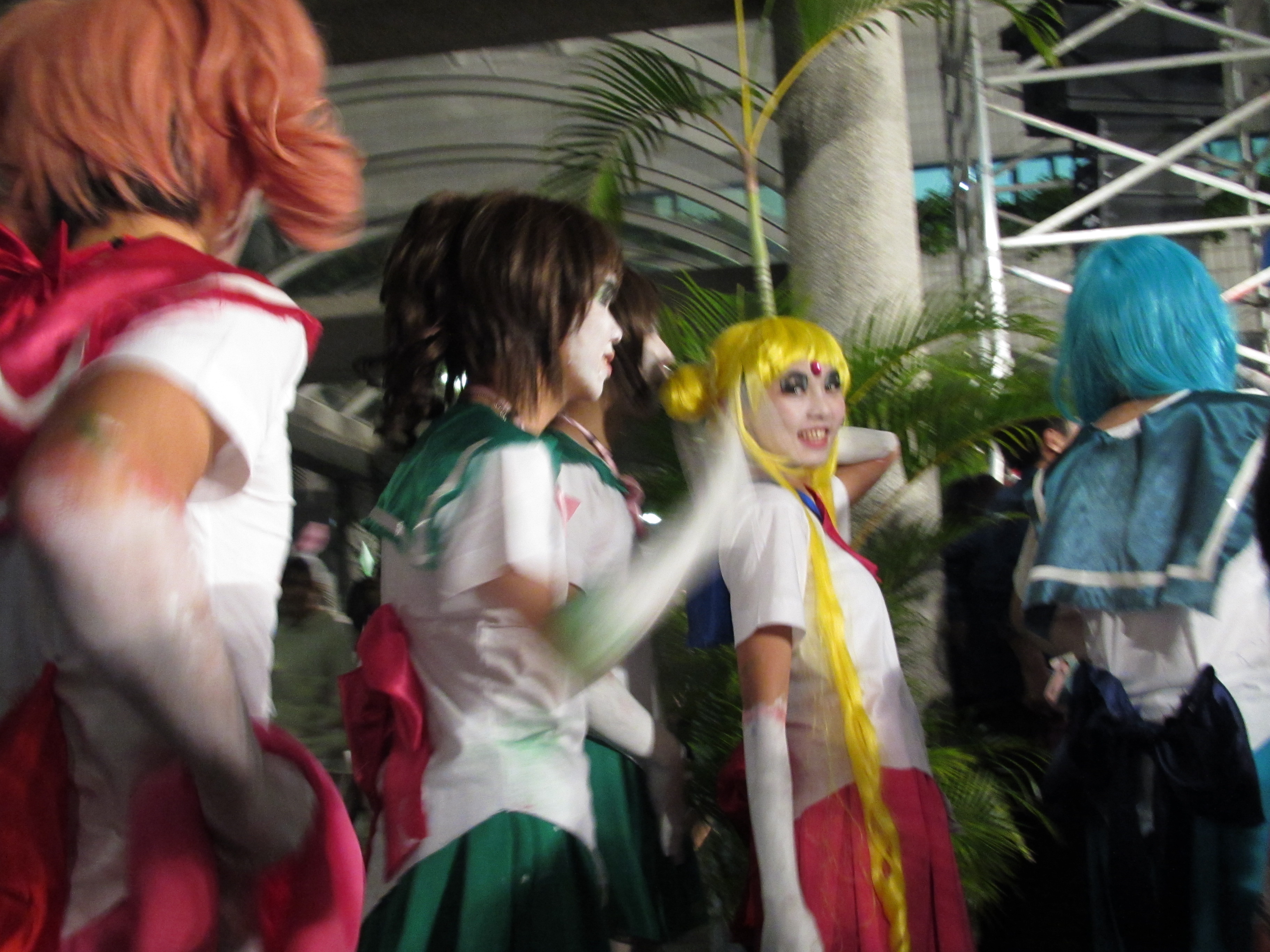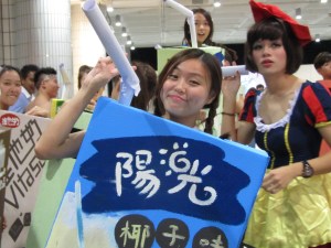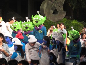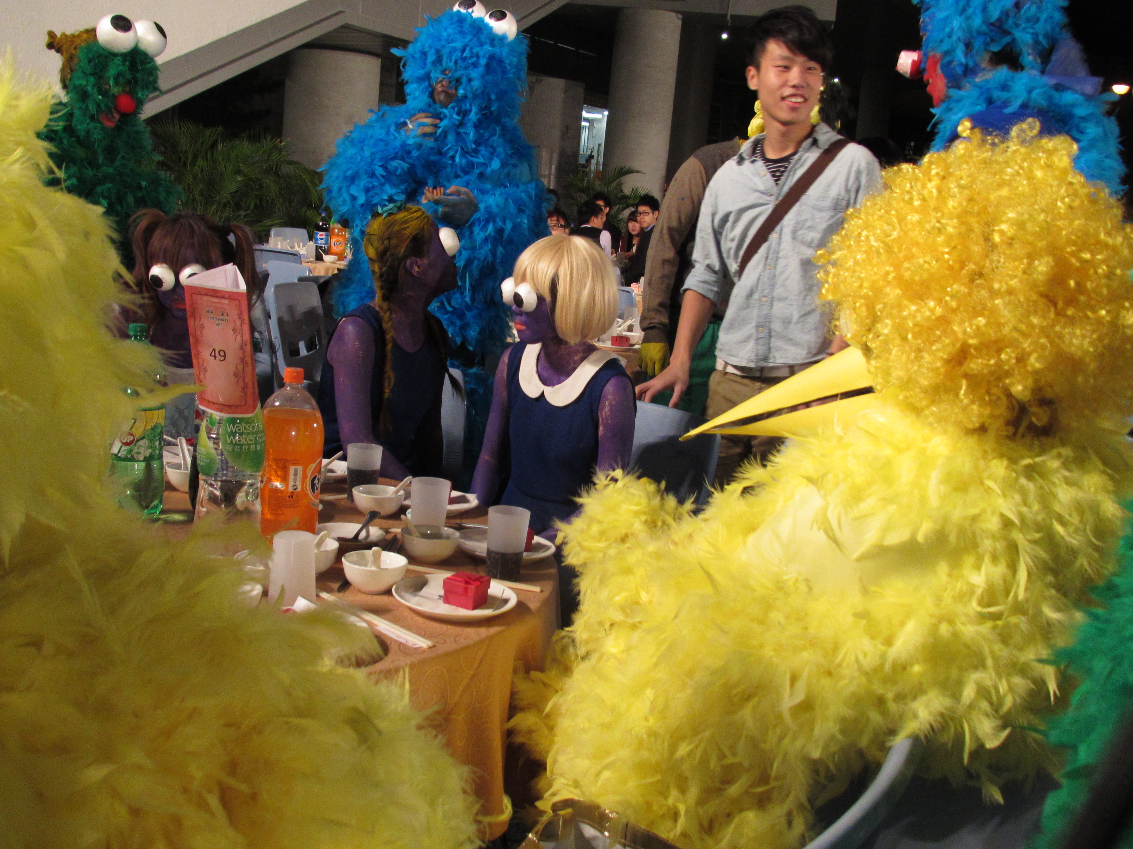 Evidently it’s a tradition for the various student groups to show up in matching costumes, which (as far as we could determine) don’t have anything to do with their particular club or organization. So, for example, you got yer Sesame Street characters: