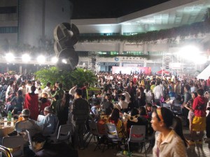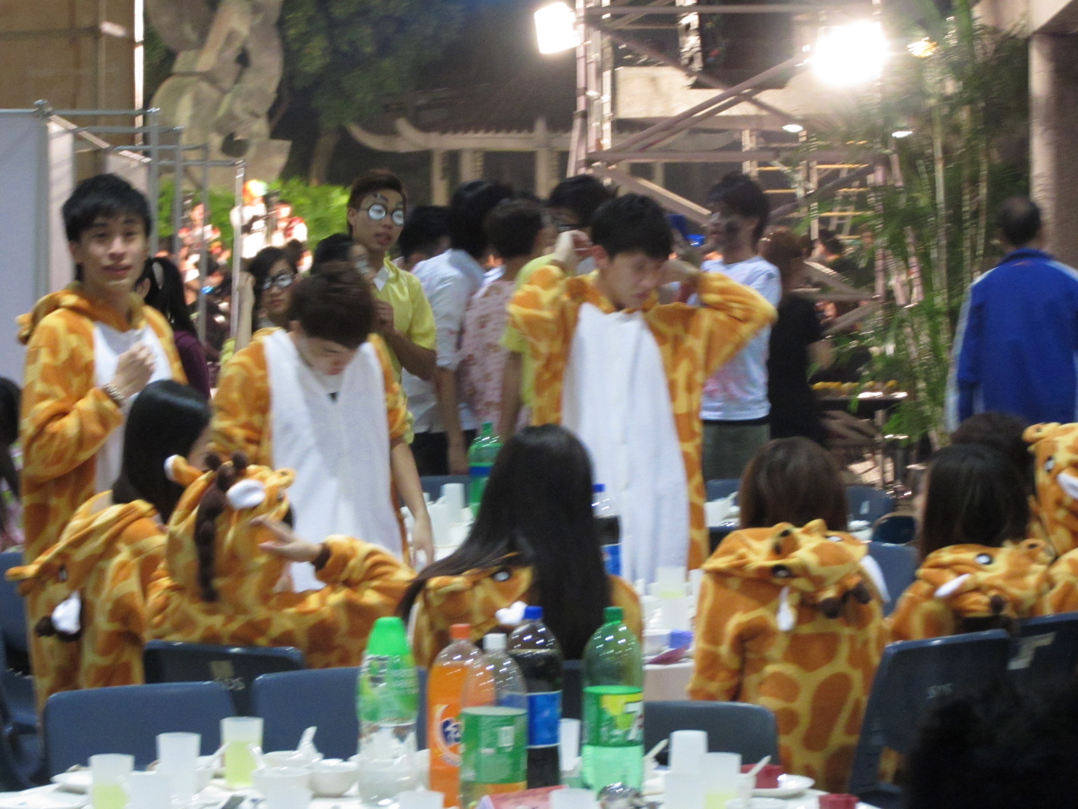 A couple of weekends ago we had the unique opportunity to attend the City University Banquet. This is an annual event put on by the Student Union, largely as a fundraiser but also in large part as a hell-raiser. (Hey now!) One of the open spaces, normally a rather staid taxi drop-off point near the gym and the main administration building, gets transformed into a giant sea of tables, with a stage at one end and massive sound and lighting gear all over. Here’s an overview: