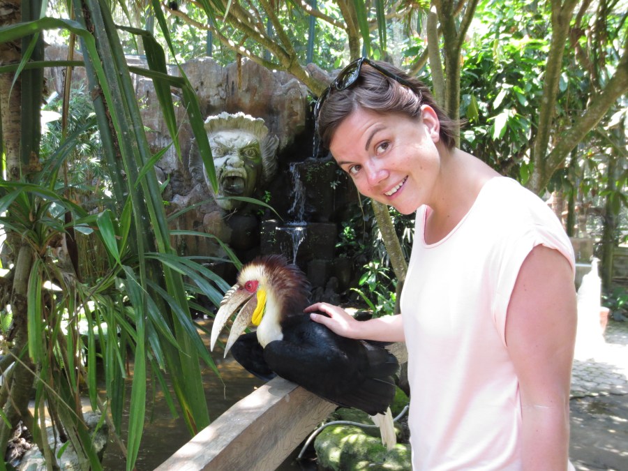 Cate petting some kind of weird bird.