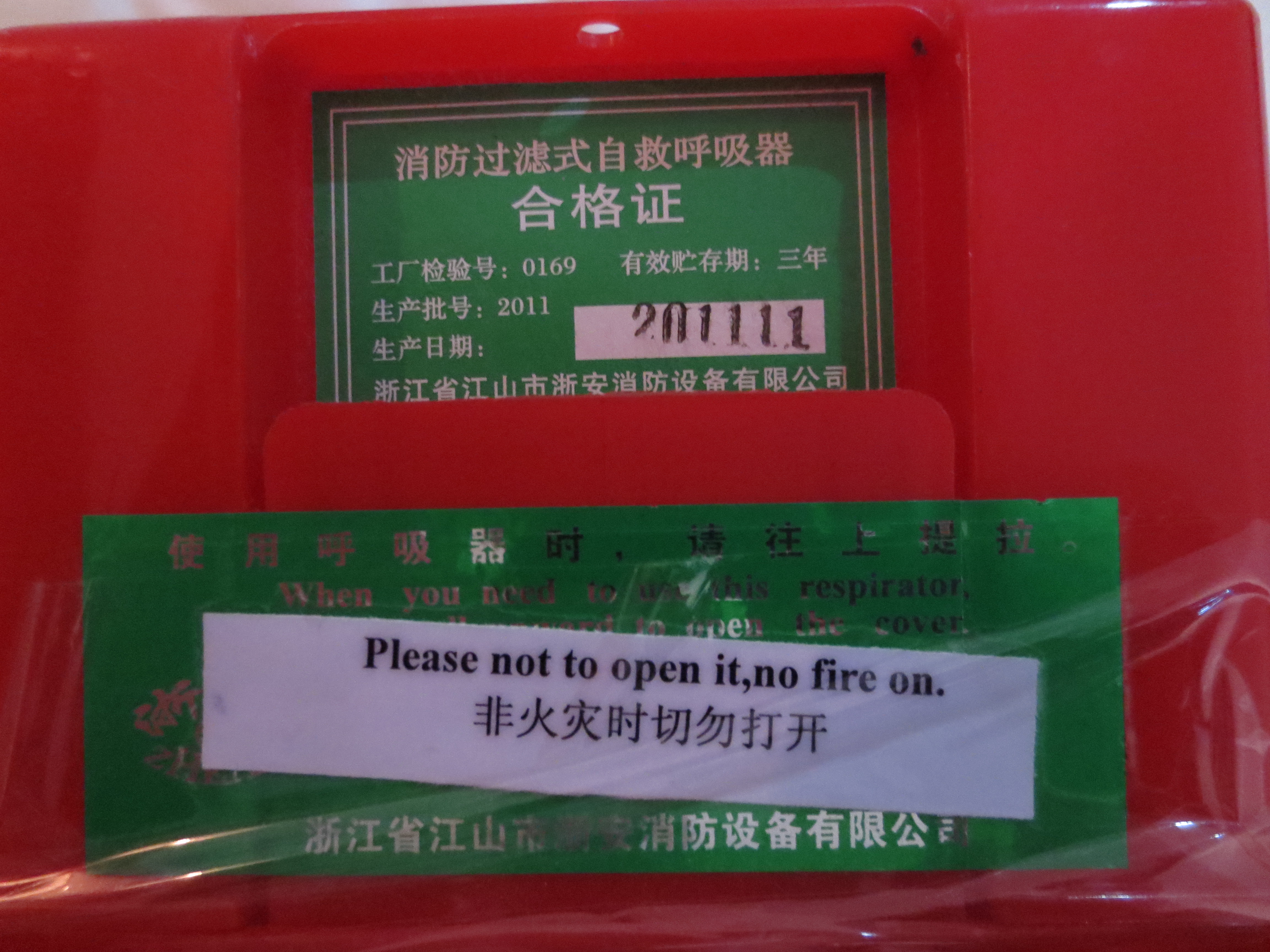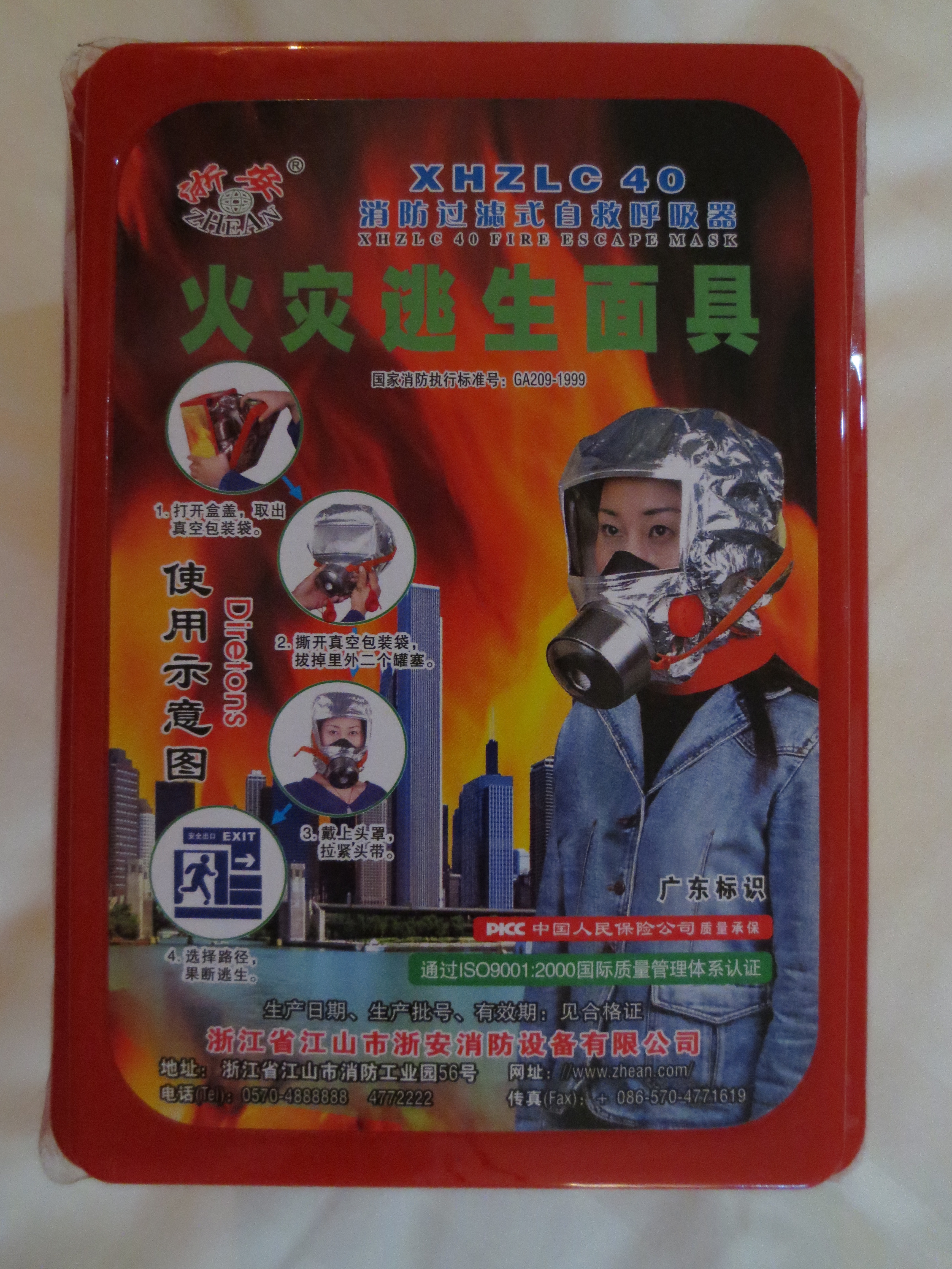 I don’t read Chinese, but I’m guessing this is what it says: “In case of terrifying, metropolis-consuming conflagration, calmly put on this aluminum respirator and a thick, acid-wash denim jacket. Stand still. Breathe normally.”