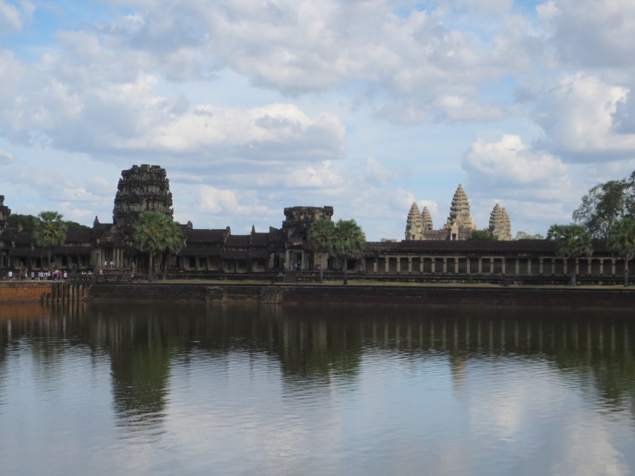 The big daddy: Angkor Wat. There is a gigantic moat around the entire complex; a stone “Rainbow Bridge” leads in from the west (just visible on the left). Angkor is distinctive, in fact, for facing west rather than east; there is no consensus as to why this was done, though there are several theories.