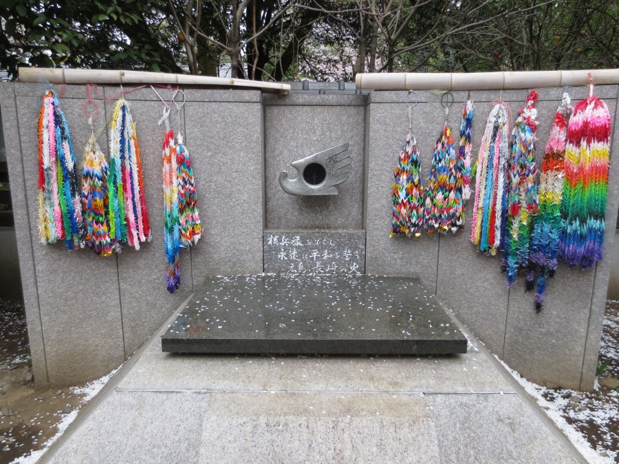 This memorial in Tokyo’s Ueno park has a flame lit from embers from Hiroshima and Nagasaki. The colorful garlands flanking it are made of thousands of origami paper cranes.