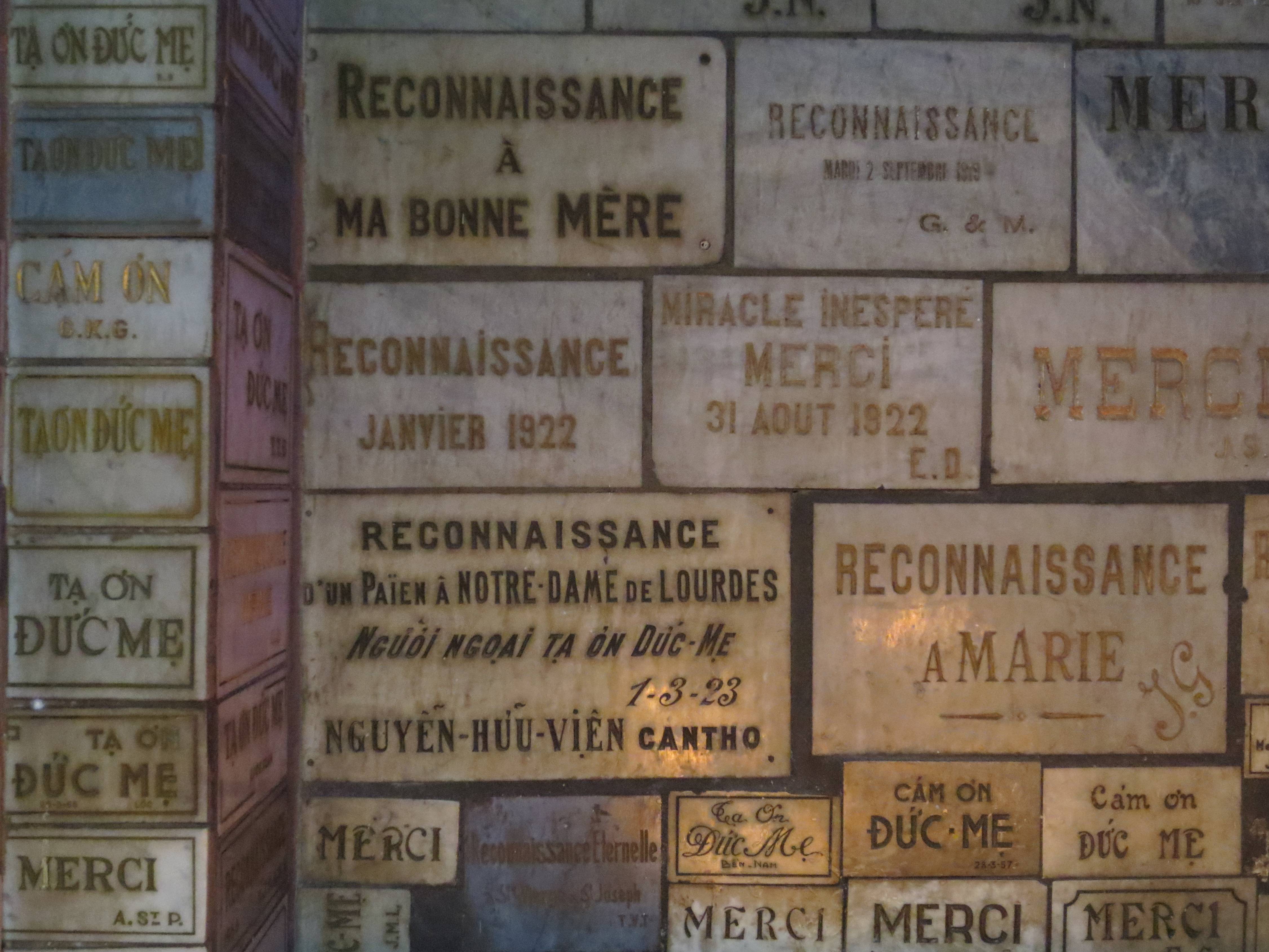 Plaques of thanksgiving date from the 19th century to the present.